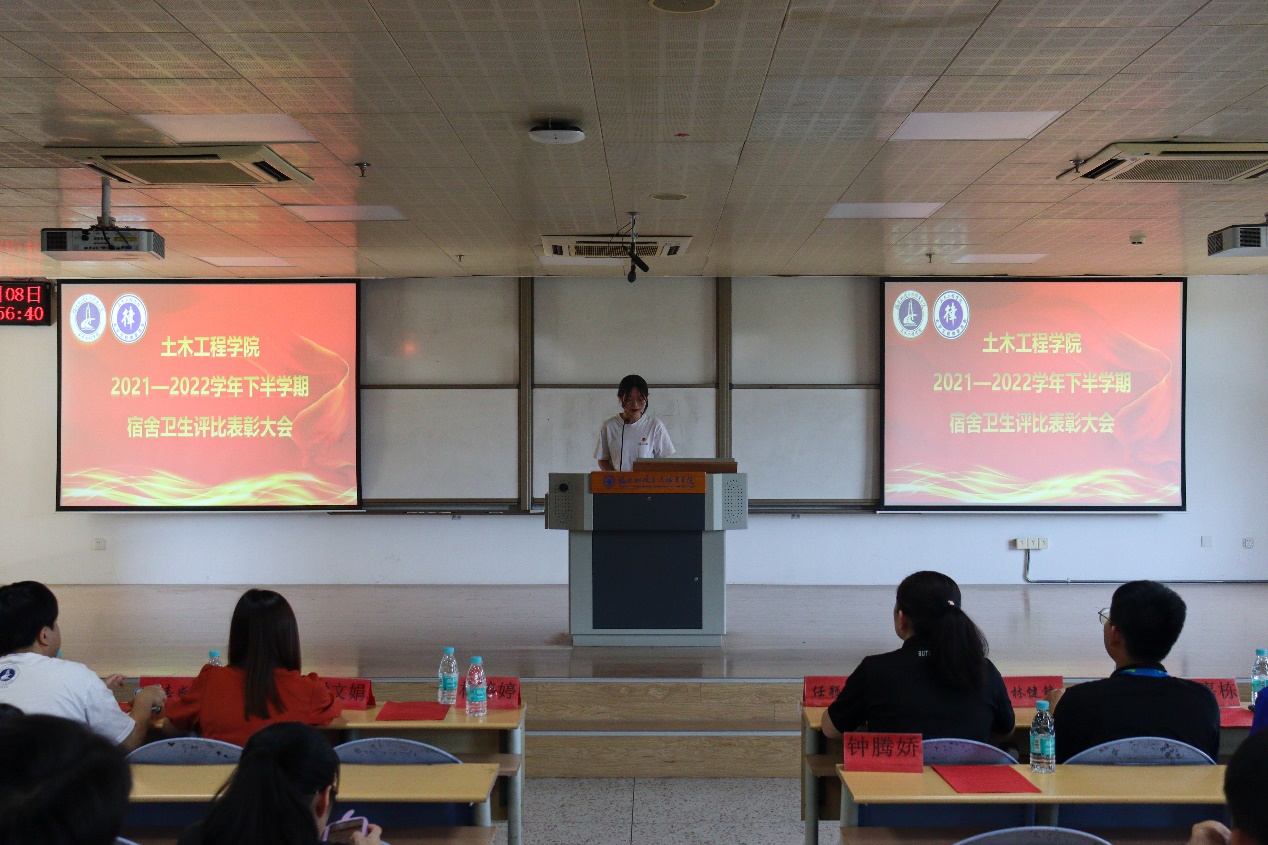 為深入貫徹落實全國教育工作會議精神,落實立德樹人根本任務,培養(yǎng)德智體美勞全面發(fā)展的社會主義建設者和接班人,持續(xù)完善育人體系,引導我院學生養(yǎng)成良好的習慣,進一步加強宿舍環(huán)境建設,營造優(yōu)良宿舍氛圍,土木工程學院于9月8日在南區(qū)科技樓305教室舉辦衛(wèi)生評比表彰大會。參與大會的領導有土木工程學院黨總支副書記任穎卿副教授和土木工程學院團委副書記林健鋒老師、輔導員老師和各宿舍代表。
