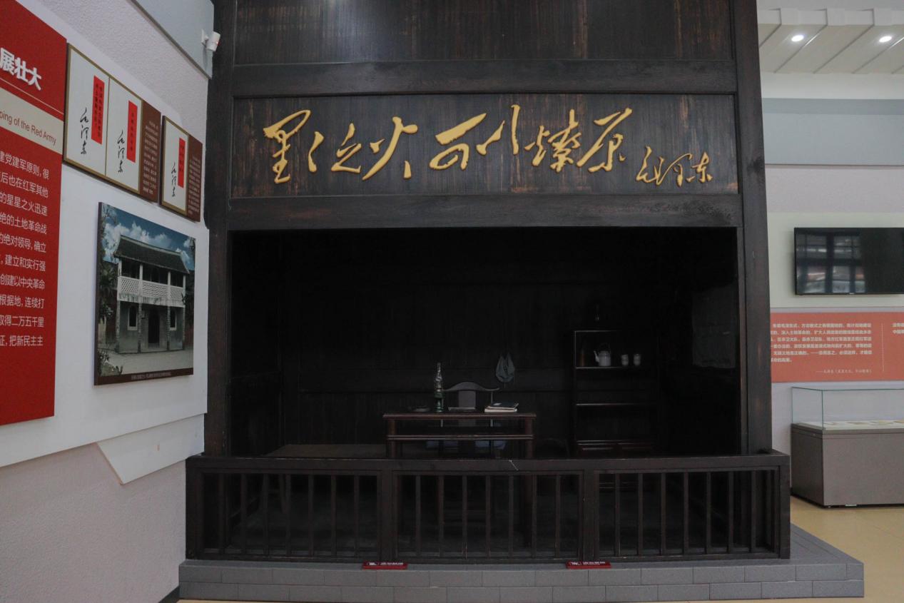 在這里,古田會議選舉產(chǎn)生了紅四軍前委委員,1929年12月,紅四軍黨的第九次代表大會(古田會議)選舉產(chǎn)生了新的中共紅四軍前敵委員會,毛澤東當(dāng)選書記。而在會場右側(cè)廂房第一間是當(dāng)年毛主席的臨時(shí)辦公室。簡陋的小房間內(nèi),橘黃的油燈散發(fā)出微微的光芒,雖然光芒微弱,卻讓實(shí)踐隊(duì)成員們感覺到了光彩四溢,圣地生輝,宛若古田會議綻放的光芒。因?yàn)樵谶@里,毛澤東關(guān)于黨的建設(shè)的思想在總結(jié)中國革命經(jīng)驗(yàn)的基礎(chǔ)上不斷豐富和發(fā)展,形成具有鮮明個性的黨建理論?!八枷虢h、政治建軍”便是古田會議確立的建黨和建軍根本原則。