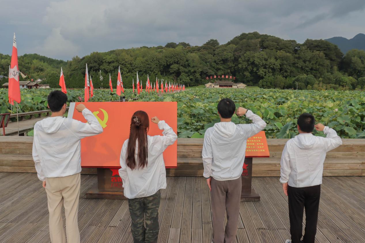 在古田會議舊址入黨誓詞宣誓處, 實(shí)踐團(tuán)全體成員在實(shí)踐隊(duì)指導(dǎo)老師的帶領(lǐng)下,右手握拳,莊嚴(yán)地向黨進(jìn)行宣誓。入黨誓詞回響百年,紅色血脈賡續(xù)綿延,初心使命歷久彌堅(jiān)。