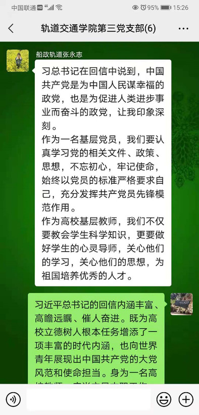 軌道交通學(xué)院青年教師陳宏意:習(xí)近平總書(shū)記的回信內(nèi)涵豐富、高瞻遠(yuǎn)矚、催人奮進(jìn)。既為高校立德樹(shù)人根本任務(wù)增添了一項(xiàng)豐富的時(shí)代內(nèi)涵,也向世界青年展現(xiàn)出中國(guó)共產(chǎn)黨的大黨風(fēng)范和使命擔(dān)當(dāng)。身為一名高校教師,應(yīng)當(dāng)立足本職工作,以立德育人為己任,引導(dǎo)青年學(xué)子聽(tīng)黨話,感恩黨,跟黨走,不忘初心、牢記使命,勇?lián)負(fù)?dān),為下一個(gè)百年目標(biāo)貢獻(xiàn)更多力量。