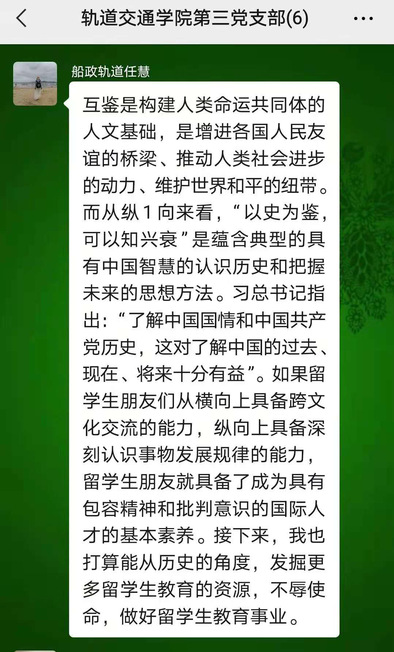 軌道交通學(xué)院青年教師任慧:互鑒是構(gòu)建人類命運(yùn)共同體的人文基礎(chǔ),是增進(jìn)各國(guó)人民友誼的橋梁、推動(dòng)人類社會(huì)進(jìn)步的動(dòng)力、維護(hù)世界和平的紐帶。而從縱1向來(lái)看,“以史為鑒,可以知興衰”是蘊(yùn)含典型的具有中國(guó)智慧的認(rèn)識(shí)歷史和把握未來(lái)的思想方法。習(xí)近平總書(shū)記指出:“了解中國(guó)國(guó)情和中國(guó)共產(chǎn)黨歷史,這對(duì)了解中國(guó)的過(guò)去、現(xiàn)在、將來(lái)十分有益”。如果留學(xué)生朋友們從橫向上具備跨文化交流的能力,縱向上具備深刻認(rèn)識(shí)事物發(fā)展規(guī)律的能力,留學(xué)生朋友就具備了成為具有包容精神和批判意識(shí)的國(guó)際人才的基本素養(yǎng)。接下來(lái),我也打算能從歷史的角度,發(fā)掘更多留學(xué)生教育的資源,不辱使命,做好留學(xué)生教育事業(yè)。