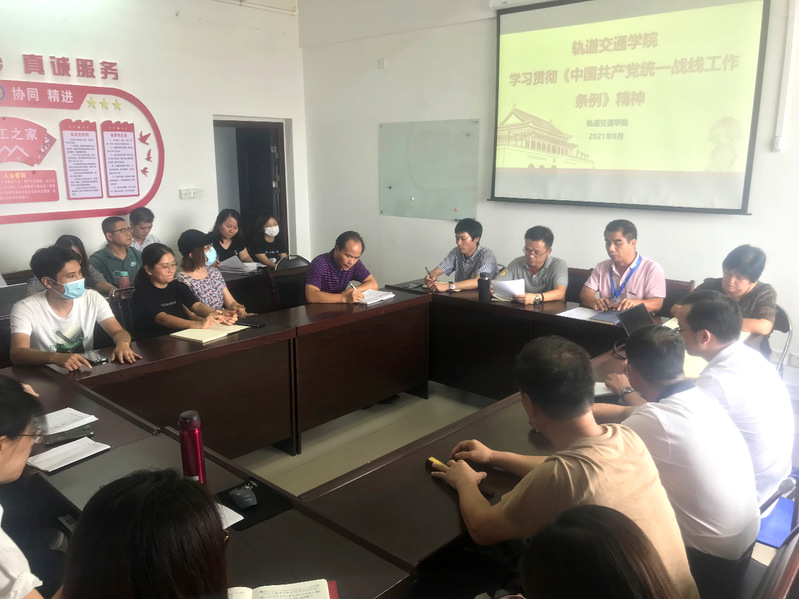 2021年8月25日下午,軌道交通學(xué)院在第一會議室舉行專題學(xué)習(xí)會,深入學(xué)習(xí)貫徹《中國共產(chǎn)黨統(tǒng)一戰(zhàn)線工作條例》(以下簡稱《條例》)。軌道交通學(xué)院黨政領(lǐng)導(dǎo)班子、全院教職工參加會議,會議由孫基書記主持。