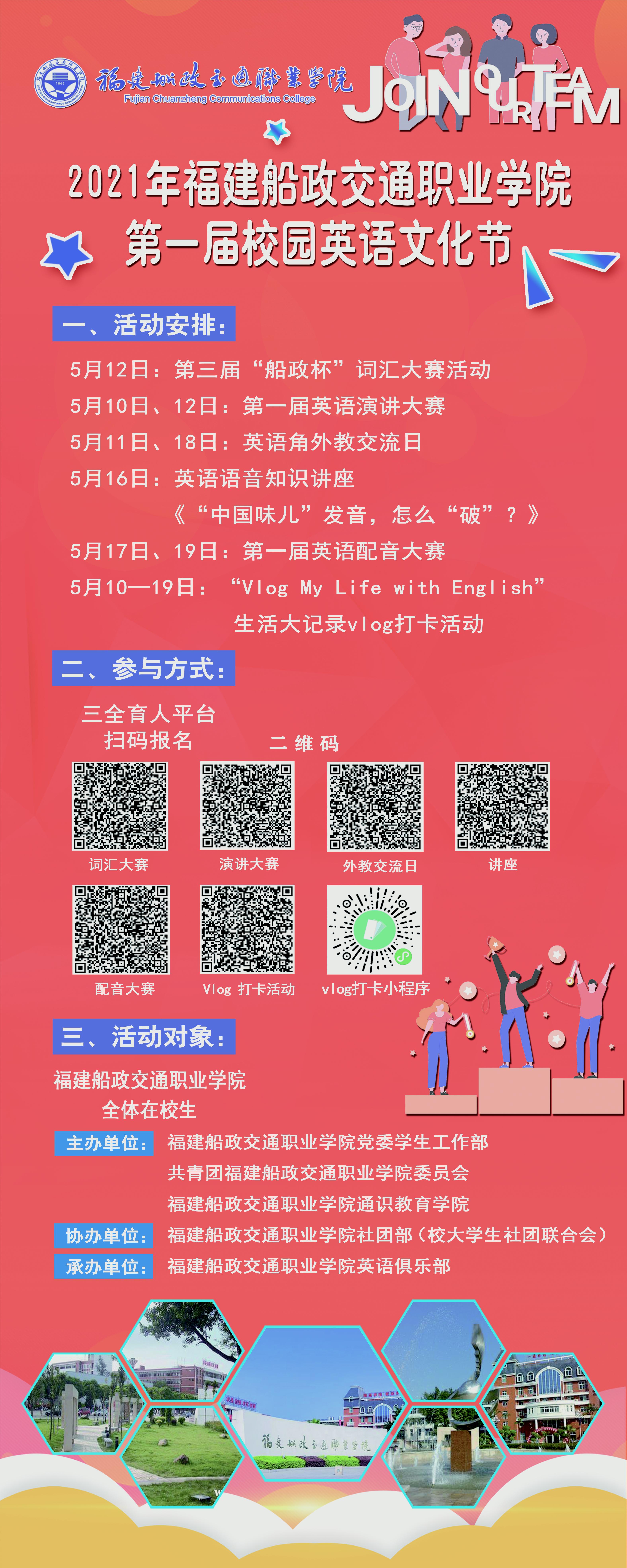 在慶祝中國共產(chǎn)黨建黨100周年之際,為貫徹落實《國家職業(yè)教育改革實施方案》等文件精神,扎實推進黨史學(xué)習(xí)教育,弘揚中華優(yōu)秀傳統(tǒng)文化,推進《高職英語》作為人文素養(yǎng)教育重要基地的建設(shè),將人文素質(zhì)教育有效地融人到英語教學(xué)和第二課堂中,堅定文化自信,更好地落實“立德樹人、文化育人”的目標(biāo),拓展學(xué)生的全球化視野,培養(yǎng)跨文化交際能力,院黨委學(xué)生工作部、院團委和通識教育學(xué)院聯(lián)合舉辦2021年福建船政交通職業(yè)學(xué)院第一屆英語文化節(jié)。