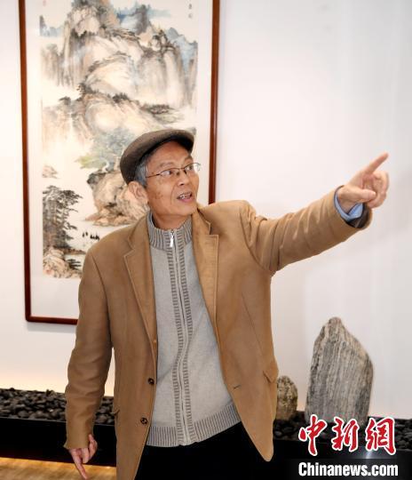 著名藝術家沈巖先生(右二)向來賓介紹在館內展出、由他本人創(chuàng)作的80多幅書畫作品。