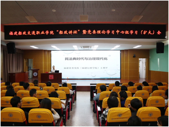 10月15日,學(xué)院舉辦“船政講壇”暨黨委理論學(xué)習(xí)中心組學(xué)習(xí)(擴(kuò)大)會,特邀福建自貿(mào)試驗(yàn)區(qū)研究院執(zhí)行院長、省委黨校法學(xué)教研部副教授王利平作題為《民法典時(shí)代和治理現(xiàn)代化》專題輔導(dǎo)講座,黨委理論學(xué)習(xí)中心組成員、副科級以上干部、各黨總支、輔導(dǎo)員、馬克思主義學(xué)院全體教師,部分學(xué)生等200余人參加。