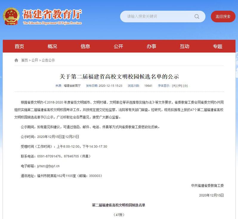 我院入選第二屆福建省高校文明校園候選名單