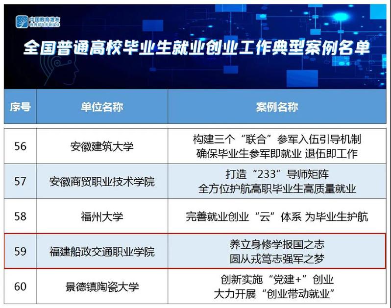 11月26日,教育部發(fā)布公告,公布了100個全國普通高校畢業(yè)生就業(yè)創(chuàng)業(yè)工作典型案例,我院《養(yǎng)立身修學(xué)報國之志 圓從戎篤志強(qiáng)軍之夢》案例成功入選,成為福建省唯一入選的高職院校。