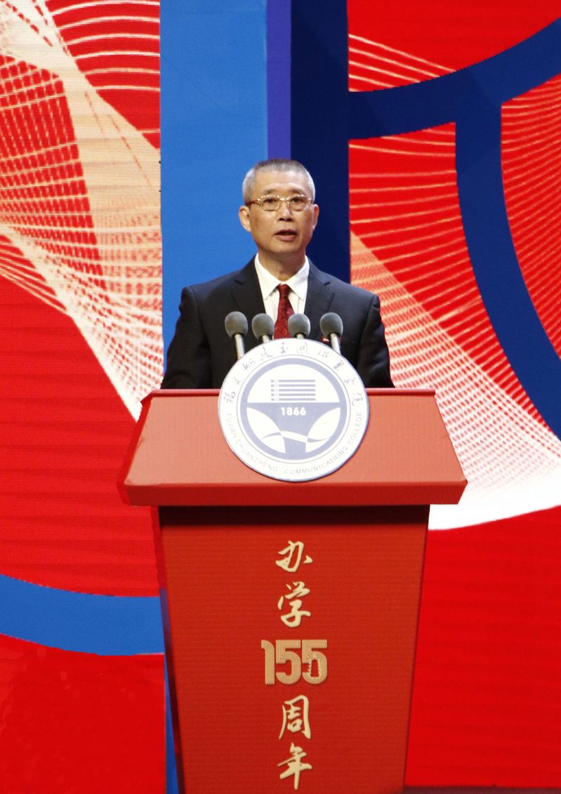 校友代表郭建康向母校表示祝賀,感懷母校桃李滿天下,為祖國交通行業(yè)培育大量優(yōu)秀人才,并祝愿在校學(xué)子爭當(dāng)有道德、有擔(dān)當(dāng)、有文化、有技術(shù)的時代新人。