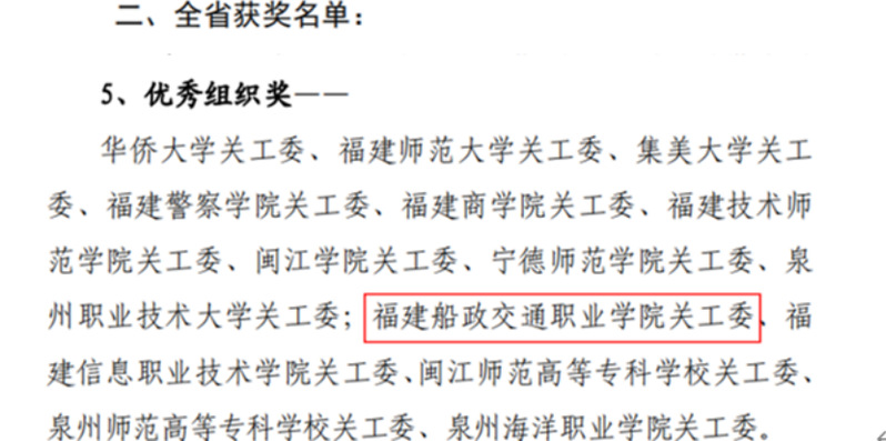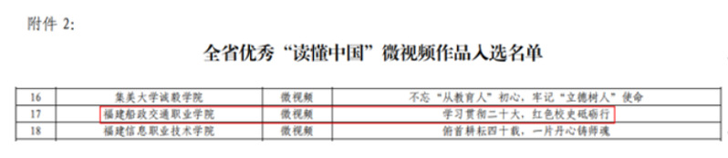 日前,福建省教育系統(tǒng)關(guān)工委公布了2023年我省高校參加“讀懂中國(guó)”活動(dòng)入選作品名單,我院關(guān)工委榮獲全省優(yōu)秀組織獎(jiǎng),微視頻《“船”承人》成功入選全省最佳“讀懂中國(guó)”微視頻作品,《學(xué)習(xí)貫徹二十大,紅色校史砥礪行》榮獲全省優(yōu)秀“讀懂中國(guó)”微視頻作品,2篇學(xué)生征文入選全省優(yōu)秀征文作品。