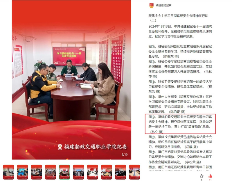 1月17日,福建省紀(jì)委監(jiān)委官網(wǎng)、福建紀(jì)檢監(jiān)察微信公眾號報(bào)道學(xué)院紀(jì)委專題學(xué)習(xí)省紀(jì)委十一屆四次全會精神,內(nèi)容如下: