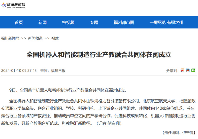 近日,全國(guó)機(jī)器人和智能制造行業(yè)產(chǎn)教融合共同體在我院成立。中國(guó)教育電視臺(tái)、福建日?qǐng)?bào)、新福建、福建教育電視臺(tái)、東南網(wǎng)等多家主流媒體平臺(tái)對(duì)此進(jìn)行集中宣傳報(bào)道。