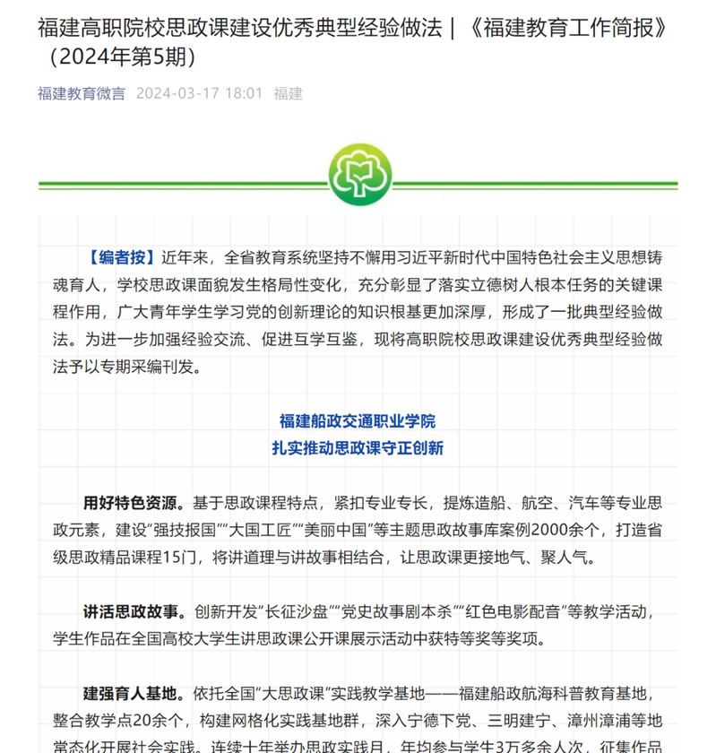 建強育人基地。依托全國“大思政課”實踐教學(xué)基地——福建船政航??破战逃?,整合教學(xué)點20余個,構(gòu)建網(wǎng)格化實踐基地群,深入寧德下黨、三明建寧、漳州漳浦等地常態(tài)化開展社會實踐。連續(xù)十年舉辦思政實踐月,年均參與學(xué)生3萬多余人次,征集作品2萬余件。