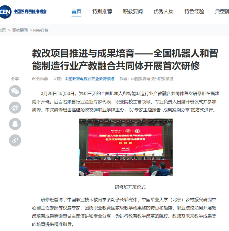 3月28日-3月30日,為期三天的全國機(jī)器人和智能制造行業(yè)產(chǎn)教融合共同體首次研修班在福建南平開班。近百名來自行業(yè)企業(yè)專家代表、職業(yè)院校主管領(lǐng)導(dǎo)、專業(yè)負(fù)責(zé)人出席開班儀式并參加研修。本次研修班由福建船政交通職業(yè)學(xué)院主辦,以“專家主題報(bào)告+成果案例分享”的方式進(jìn)行。