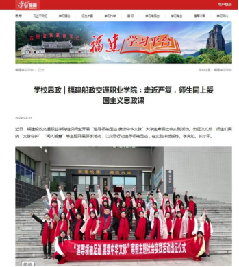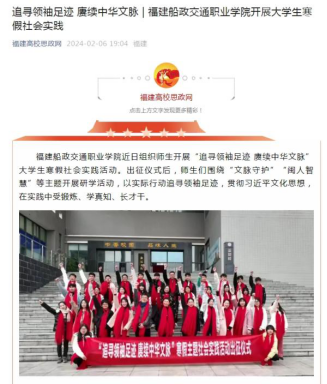 學(xué)院認(rèn)真落實(shí)福建省委教育工委要求,統(tǒng)籌部署、協(xié)同開(kāi)展追尋領(lǐng)袖足跡 賡續(xù)中華文脈大學(xué)生寒假社會(huì)實(shí)踐,成立社會(huì)實(shí)踐隊(duì),走進(jìn)嚴(yán)復(fù)故居、嚴(yán)復(fù)博物館等場(chǎng)所,開(kāi)展文脈守護(hù)”“閩人智慧等主題開(kāi)展研學(xué)活動(dòng),把小我融入到大我,在社會(huì)實(shí)踐中堅(jiān)定前行方向、找準(zhǔn)人生坐標(biāo)、扛起責(zé)任擔(dān)當(dāng)。本次主題社會(huì)實(shí)踐活動(dòng)得到學(xué)習(xí)強(qiáng)國(guó)福建學(xué)習(xí)平臺(tái)、福建高校思政網(wǎng)、新福建等多家媒體報(bào)道,取得了良好的育人成效和社會(huì)認(rèn)可。