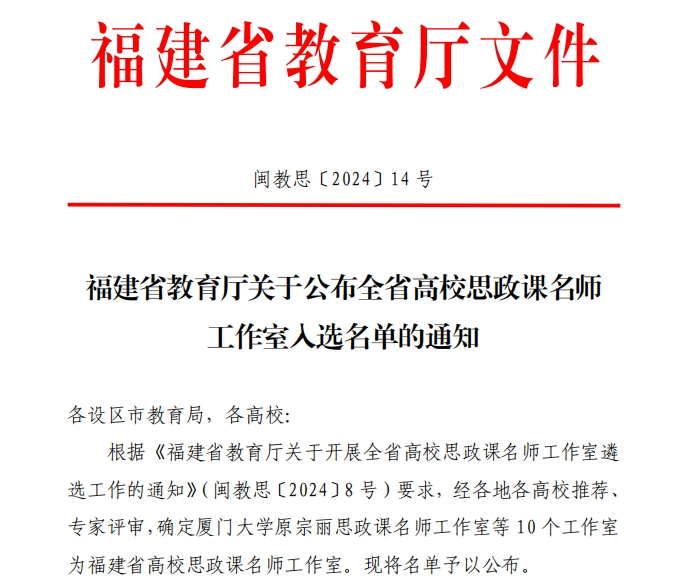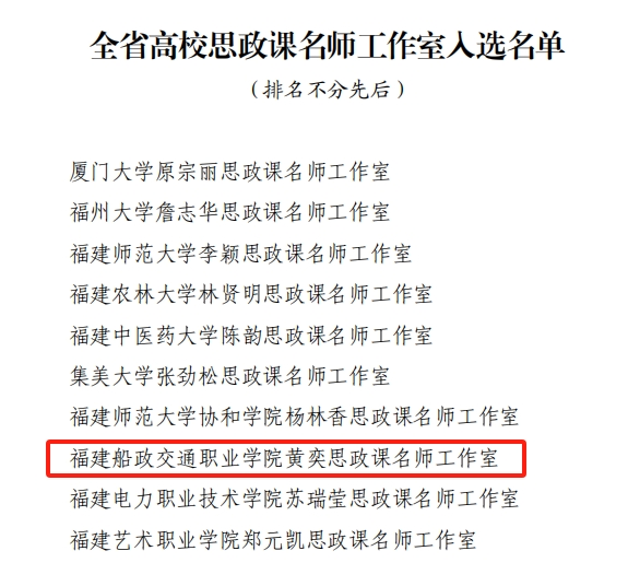 近日,福建省教育廳公布了全省高校思政課名師工作室入選名單的通知,我院馬克思主義學院黃奕思政課名師工作室成功入選。