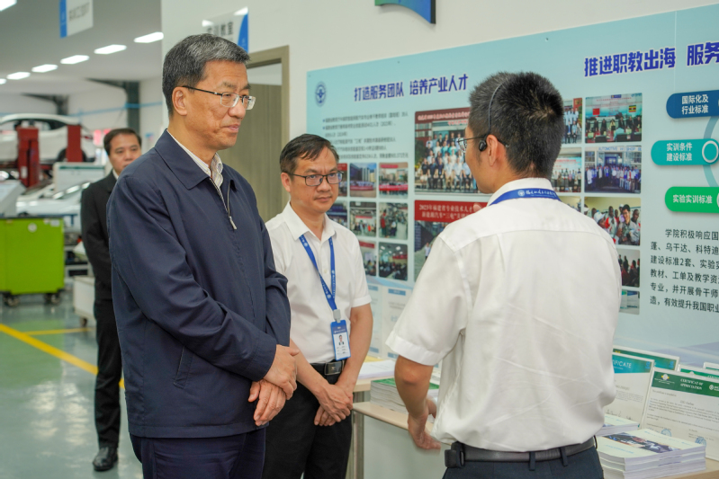 在新能源汽車產(chǎn)教融合示范園,懷進鵬部長與教師代表親切交流,深入了解校企“七個共同”共建新能源汽車產(chǎn)教融合示范園的經(jīng)驗做法,肯定了學(xué)院積極服務(wù)和融入“一帶一路”倡議、教隨產(chǎn)出,建設(shè)沙特海絲學(xué)院的工作成效。在交通土建智慧檢測產(chǎn)教融合實訓(xùn)基地,懷進鵬部長重點了解了云課堂的效果,聽取了專業(yè)應(yīng)對產(chǎn)業(yè)升級轉(zhuǎn)型的對策,對開展技術(shù)服務(wù)給予了肯定。在先進艦船模擬器實訓(xùn)中心,懷進鵬部長詳細(xì)了解了人才培養(yǎng)的有關(guān)情況,觀看了心瀾船社學(xué)生非遺手工作品——福船代表趕繒船的模型。在航空實訓(xùn)基地,懷進鵬部長重點了解學(xué)院軍民融合開展產(chǎn)品設(shè)計研發(fā)的有關(guān)情況,并給予勉勵。