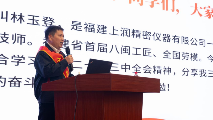 啟動(dòng)儀式后,全國勞動(dòng)模范、全國技術(shù)能手、享受國務(wù)院政府特殊津貼專家福建上潤精密儀器有限公司林玉登分享他30年工作的艱辛歷程和生動(dòng)事跡。他三十年如一日認(rèn)真做好精密制造這一件事,“簡單的事情重復(fù)做,重復(fù)的事情堅(jiān)持做”,他用堅(jiān)持不懈、永不放棄的精神為推動(dòng)福建傳統(tǒng)產(chǎn)業(yè)轉(zhuǎn)型升級(jí)和智能制造做出了積極貢獻(xiàn)。在場的觀眾都從林玉登勞模事跡中深刻感悟勞模精神、勞動(dòng)精神、工匠精神的實(shí)質(zhì)內(nèi)涵。
