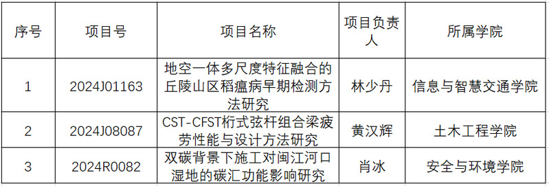 近日,從福建省科技廳獲悉,我院林少丹、黃漢輝、肖冰等3位老師主持申報的項目獲2024年度福建省科技計劃項目立項,分別獲批項目涵蓋省自然科學(xué)基金面上項目、創(chuàng)青項目及省創(chuàng)新戰(zhàn)略研究科技計劃項目。