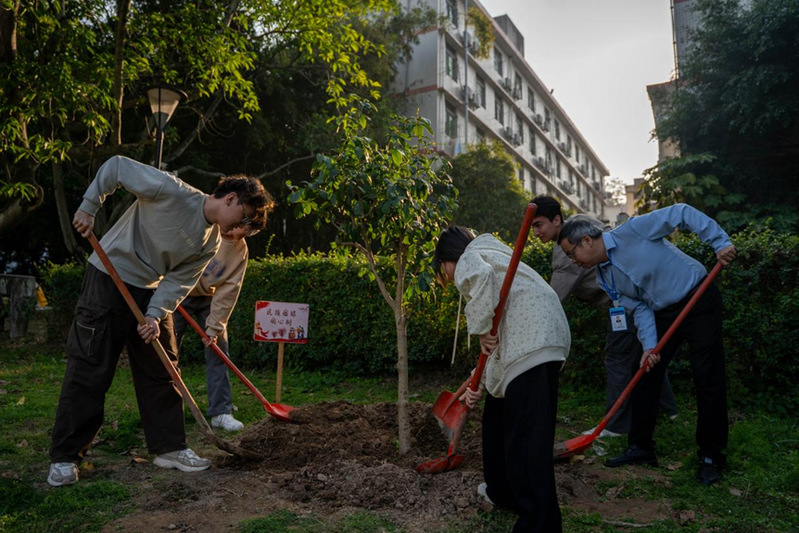 最后,在“一站式”學生社區(qū)“開心農(nóng)場”勞動實踐基地,陳常暉副院長與少數(shù)民族學生共同種下“民族團結(jié)同心樹”。