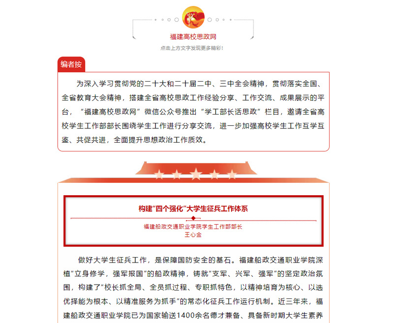 為深入學(xué)習(xí)貫徹黨的二十大和二十屆二中、三中全會精神,貫徹落實全國、全省教育大會精神,搭建全省高校思政工作經(jīng)驗分享、工作交流、成果展示的平臺,“福建高校思政網(wǎng)”微信公眾號推出“學(xué)工部長話思政”欄目,邀請全省高校學(xué)生工作部部長圍繞學(xué)生工作進(jìn)行分享交流,進(jìn)一步加強(qiáng)高校學(xué)生工作互學(xué)互鑒、共促共進(jìn),全面提升思想政治工作質(zhì)效。