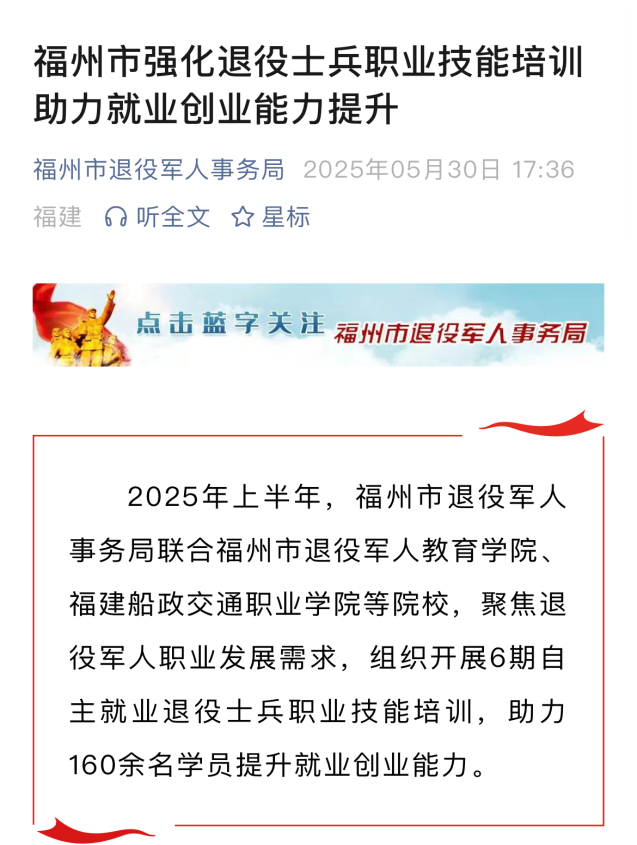2025年上半年,福州市退役軍人事務局聯(lián)合福州市退役軍人教育學院、福建船政交通職業(yè)學院等院校,聚焦退役軍人職業(yè)發(fā)展需求,組織開展6期自主就業(yè)退役士兵職業(yè)技能培訓,助力160余名學員提升就業(yè)創(chuàng)業(yè)能力。