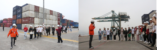 在海盈碼頭工作人員的引導(dǎo)下,同學(xué)們有序進(jìn)入碼頭前沿,由海盈碼頭操作部經(jīng)理助理王勇介紹碼頭的安全注意事項(xiàng),并利用碼頭的資源,向?qū)W生介紹集裝箱、碼頭構(gòu)造、機(jī)械設(shè)備、艙蓋板和倉庫等方面的知識(shí),也詳細(xì)介紹了集裝箱在碼頭內(nèi)部的整個(gè)流轉(zhuǎn)過程。