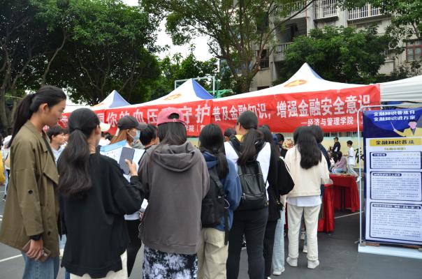 活動現(xiàn)場,老師和志愿者們通過分發(fā)金融知識宣傳單和手把手教學(xué)的形式,為來往的同學(xué)介紹普及日常生產(chǎn)生活所必要的金融基礎(chǔ)知識、禮儀知識、急救知識,同學(xué)們或在宣傳板前駐足觀看,或向志愿者咨詢問題,現(xiàn)場科普氛圍濃烈。