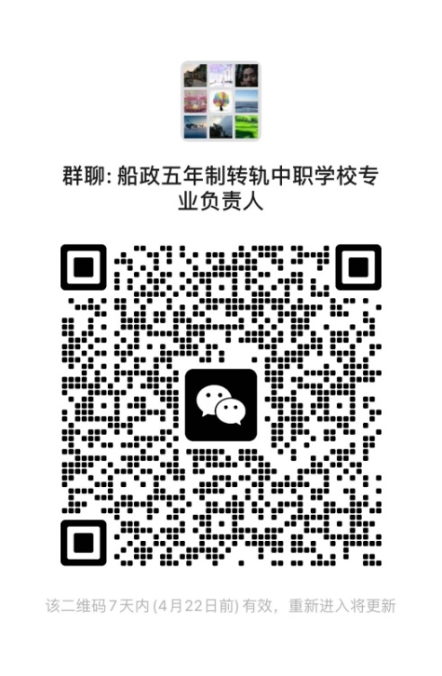請各合作中職學(xué)校負(fù)責(zé)機(jī)房安裝的技術(shù)老師4月22日前加入微信群“船政五年制轉(zhuǎn)軌考核技術(shù)群”(圖一),各合作中職學(xué)校專業(yè)負(fù)責(zé)人4月19日前加入微信群“船政五年制轉(zhuǎn)軌中職學(xué)校專業(yè)負(fù)責(zé)人群”(圖二)。