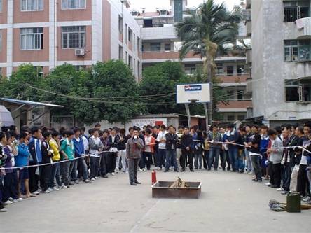 隨著呼救聲的響起,只見煙霧從窗口冒出,組織人員安排現(xiàn)場同學(xué)以宿舍為單位,井然有序的用濕毛巾捂住口鼻從樓梯撤下聚集到安全場所。在進(jìn)行兩次演練后,保衛(wèi)科老師為同學(xué)們講述了關(guān)于消防的知識(shí),在大火中如何逃生和使用滅火器。并在空地上進(jìn)行了滅火的實(shí)際操作演練。