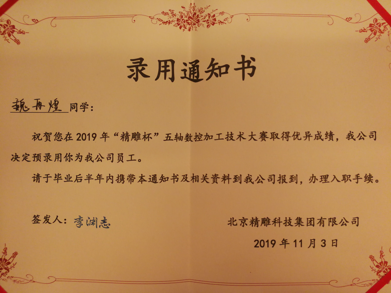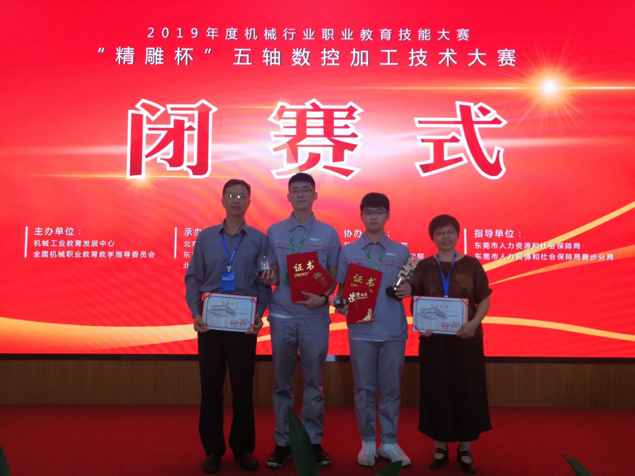 2019年度全國機械行業(yè)職業(yè)教育技能大賽——“精雕杯”五軸數(shù)控加工技術(shù)的比賽于10月31日至11月2日在廣東東莞舉行,我院學(xué)生吳仲川、魏再煌組成的代表隊榮獲全國第二名暨一等獎,指導(dǎo)教師李云妹、謝祖華被評為“優(yōu)秀指導(dǎo)教師”,吳仲川、魏再煌兩位同學(xué)憑借嫻熟的技能和優(yōu)異的表現(xiàn)直接被北京精雕科技集團有限公司錄用,畢業(yè)后可直接前往北京辦理入職手續(xù)。