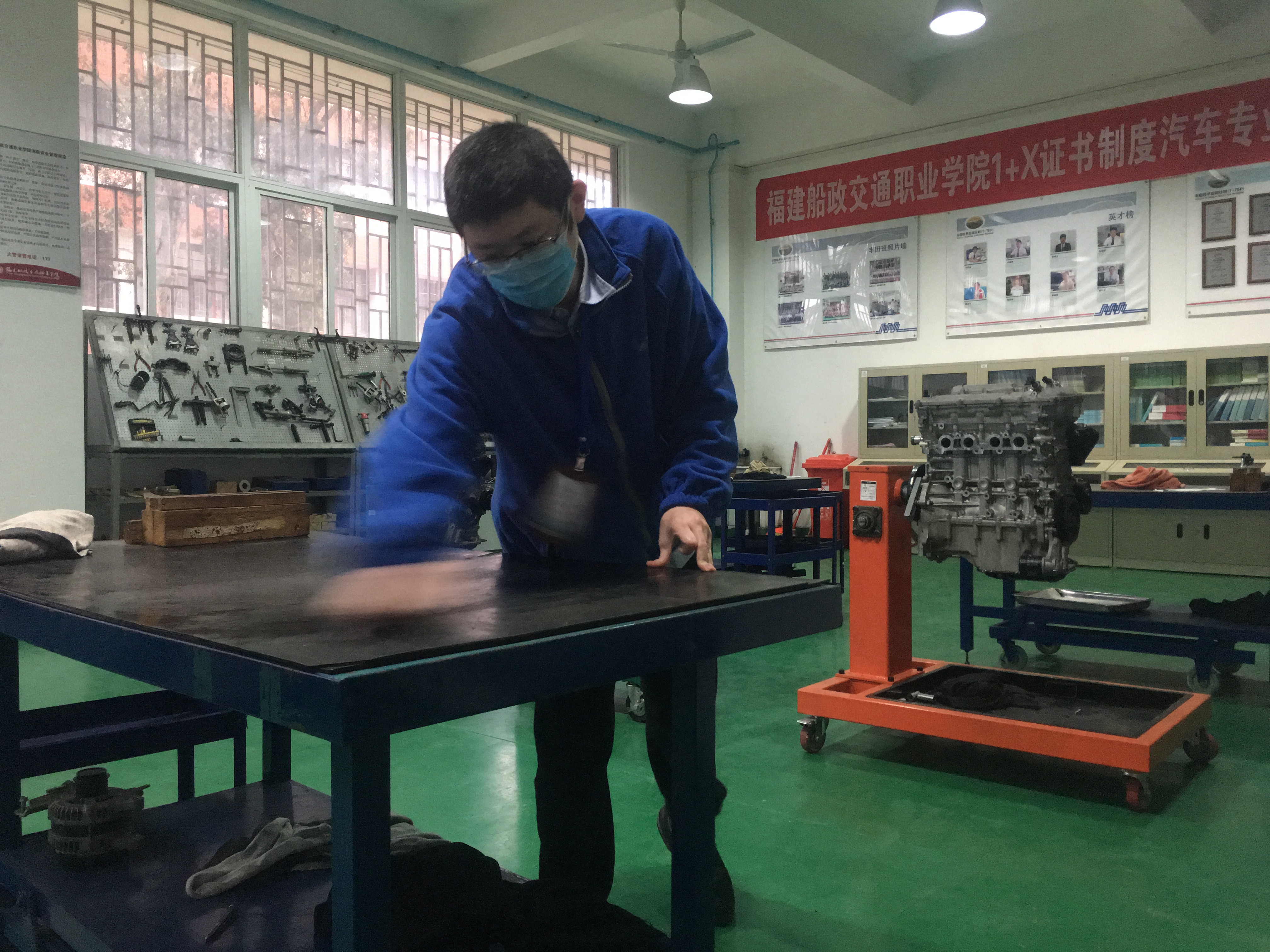 在營銷實訓(xùn)室,陳旸老師和鄭冰鑫老師認真的整理了教室衛(wèi)生;在奧迪培訓(xùn)中心,杜盼成老師精心地“照顧”奧迪設(shè)備;在豐田實訓(xùn)中心和福特實訓(xùn)中心,黃知秋老師和柯曄偉老師仔細地檢查工具設(shè)備、整理工位、做好衛(wèi)生;陳建釗老師把汽車電器構(gòu)造與維修實訓(xùn)室打掃的一塵不染;鄭鵬老師仔細的將基礎(chǔ)實訓(xùn)室的衛(wèi)生打掃得干干凈凈,還特意整理了油品儲藏間,確保危險化學(xué)品的安全存放。