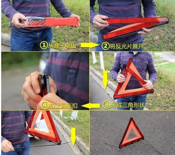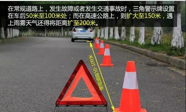 當(dāng)汽車在行駛當(dāng)中出現(xiàn)異常,需要緊急靠邊停車進(jìn)行輪胎更換時(shí),須拉好手剎、打開雙閃警報(bào)燈,一定要按規(guī)定擺放三角警示牌,具體操作如下如所示: