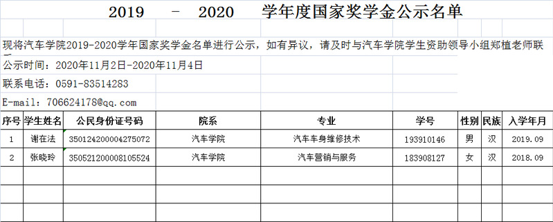 國(guó)家獎(jiǎng)學(xué)金公示表(汽車學(xué)院)