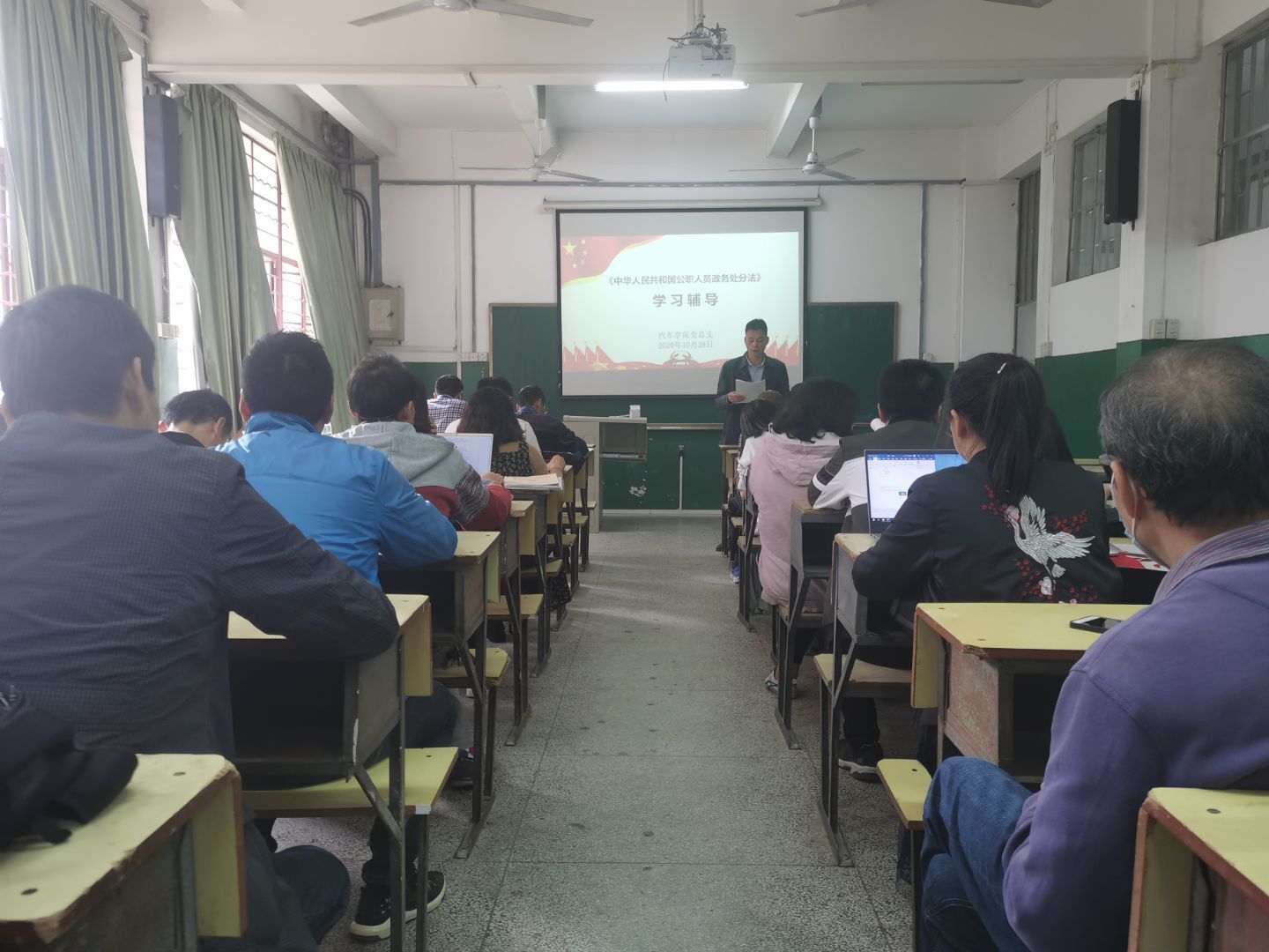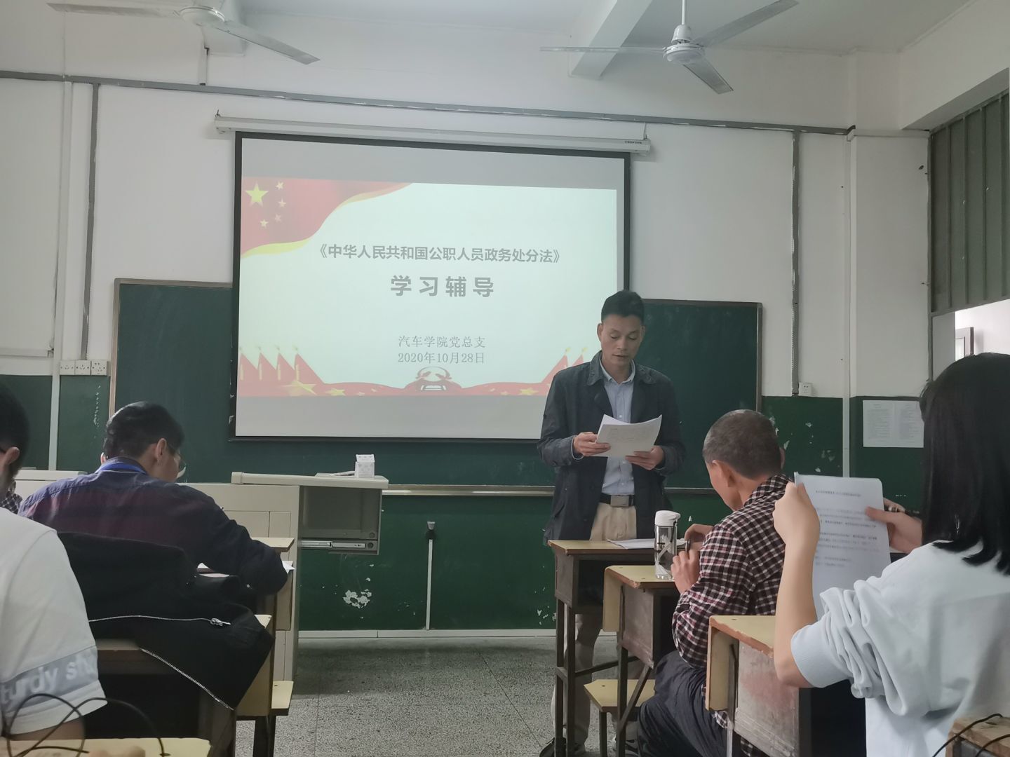 2020年10月28日下午在10號樓104教室,汽車學院全體教職工開展《政務處分法》學習會。
