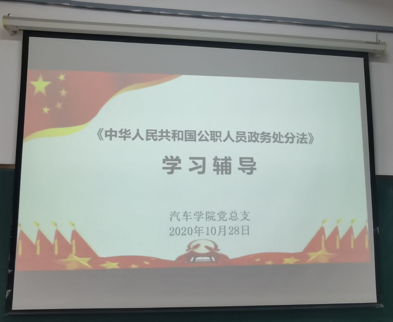 2020年10月28日下午在10號(hào)樓104教室,汽車學(xué)院全體教職工開展《政務(wù)處分法》學(xué)習(xí)會(huì)。