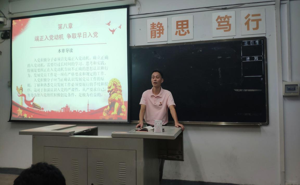 開班儀式后蔡華錦書記為學(xué)員上《明確中國(guó)共產(chǎn)黨黨員的條件和義務(wù)、權(quán)利》、《端正入黨動(dòng)機(jī),爭(zhēng)取早日入黨》的黨課。作為申請(qǐng)入黨和已經(jīng)入黨的人都必須了解中國(guó)共產(chǎn)黨黨員的條件,加入黨組織的成員既要履行一定的義務(wù),同時(shí)也享有黨章所規(guī)定的一定的權(quán)利。忠實(shí)履行黨員義務(wù)和積極行使黨員權(quán)利是黨員先進(jìn)性的集中體現(xiàn),說(shuō)明了黨員義務(wù)與權(quán)利兩者間辯證統(tǒng)一、相輔相成的關(guān)系。確立正確的入黨動(dòng)機(jī),需要經(jīng)過(guò)長(zhǎng)時(shí)間的學(xué)習(xí)、思考和實(shí)踐,特別是要糾正在入黨動(dòng)機(jī)方面不正確的思想認(rèn)識(shí)和行為,同學(xué)們要樹立正確的入黨動(dòng)機(jī),加強(qiáng)思想修養(yǎng),提高政治素質(zhì),嚴(yán)于律己,樹立為人民服務(wù)的理念,從小事做起,堅(jiān)定理想信念,發(fā)揮黨員的先鋒模范作用。在場(chǎng)的同學(xué)們認(rèn)真聆聽,牢牢記住了蔡華錦書記講授的內(nèi)容和寄予的期望。