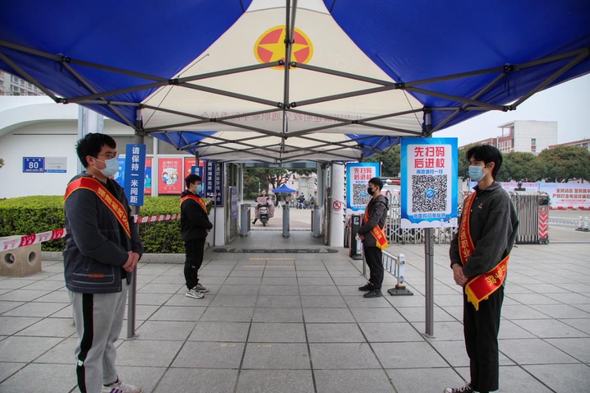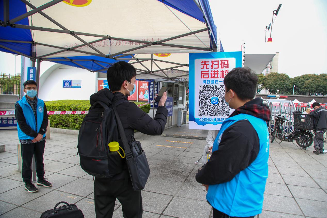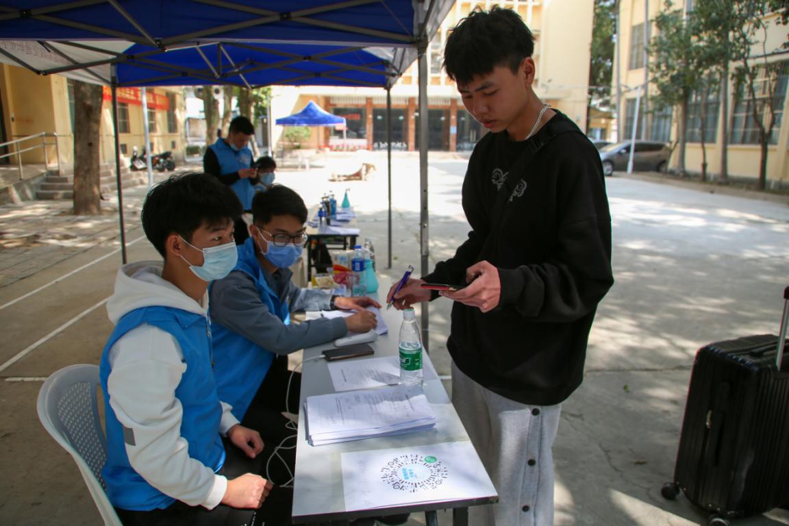 報(bào)道點(diǎn)志愿者對(duì)返校學(xué)生進(jìn)行登記,并進(jìn)行體溫監(jiān)測登記以及收集同學(xué)們上交的《健康承諾書》。