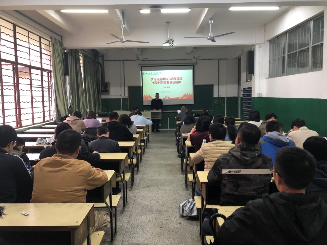 3月31日下午,汽車學院黨總支召開全院教職工大會,學習貫徹習近平總書記來閩考察的重要講話精神,傳達學習《中共福建省委關于認真學習宣傳貫徹落實習近平總書記在福建考察時的重要講話精神的通知》,學院黨總支書記蔡華錦主持會議并講話。