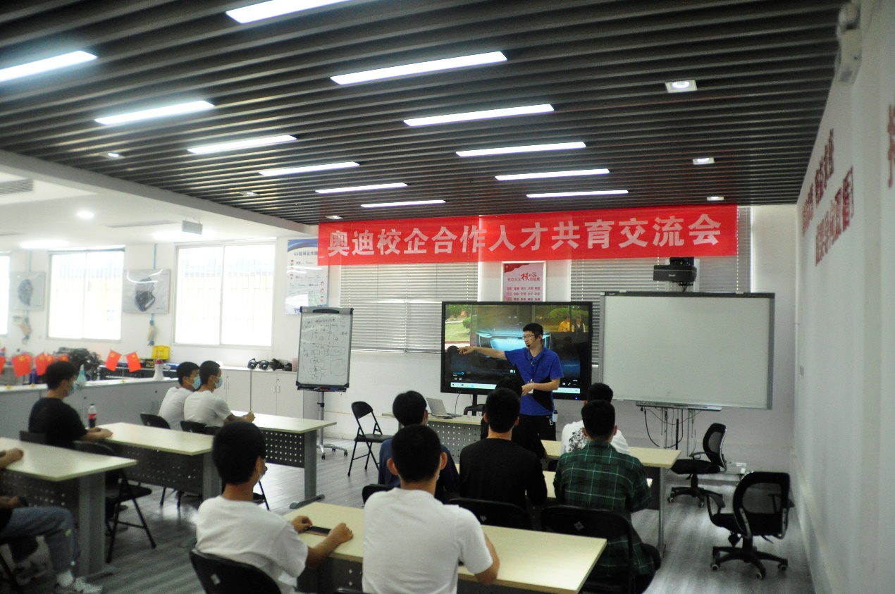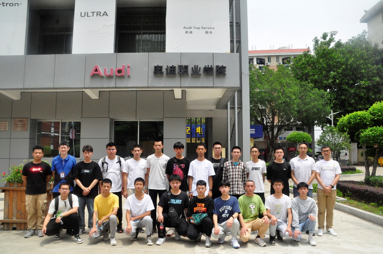 上午9點半,由福建理工學校魏日成老師和伍英賢老師帶領的20名中職學生,乘坐大巴來到南區(qū)的奧迪實訓中心。汽車學院的黃知秋老師帶領理工學校的老師和同學們參觀了一樓的奧迪機電實訓室和二樓的鈑金實訓室。
