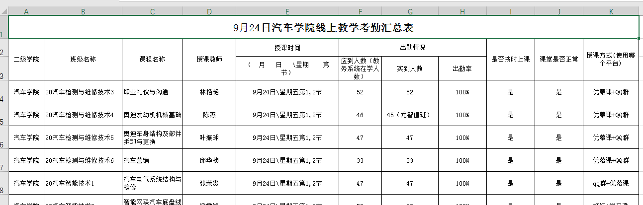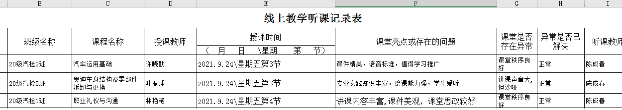 受疫情影響,2021年9月14日開始,學(xué)院全面轉(zhuǎn)為在教室上線上教學(xué)課,汽車學(xué)院利用QQ群、優(yōu)慕課等互聯(lián)網(wǎng)資源,二級督導(dǎo)實行線上巡課;每日安排輔導(dǎo)員、班主任或教研室主任深入教室和宿舍進行線下督學(xué),并利用監(jiān)控進行實時督導(dǎo)。學(xué)院每日線上線下巡課后,及時收集教師的巡課記錄單,做到及時發(fā)現(xiàn)問題、反饋問題和解決問題,做到有臺賬可依。