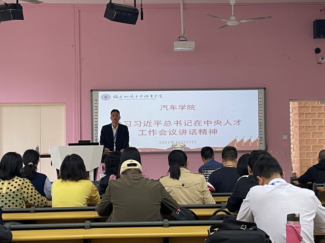 10月27日下午,汽車學(xué)院黨總支召開全院教職工大會(huì),學(xué)習(xí)貫徹習(xí)近平總書記在中央人才工作會(huì)議上重要講話精神,全體教職工參加會(huì)議,學(xué)院黨總支書記蔡華錦主持會(huì)議并講話。