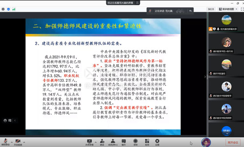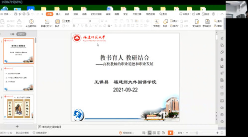 9月22日下午,福建師范大學(xué)外國(guó)語(yǔ)學(xué)院王保昌老師以“教書育人教研結(jié)合——高校教師的職業(yè)道德和職業(yè)發(fā)展”為題開展師德師風(fēng)專題培訓(xùn),分享對(duì)教師職業(yè)的理解,闡明高校教師師德師風(fēng)建設(shè)的重要性,從時(shí)代變化分析高校教師職業(yè)發(fā)展中的機(jī)遇與挑戰(zhàn),提出發(fā)展方向、道路等工作建議,既要做到“學(xué)高為師,身正為范”,具備有高超的教育教學(xué)能力,更要有高尚的人格品質(zhì),爭(zhēng)做“四有”好老師、當(dāng)好“四個(gè)引路人”、實(shí)現(xiàn)“四個(gè)相統(tǒng)一”。最后,王老師建議,高校教師要結(jié)合教學(xué)工作開展教學(xué)研究,以教學(xué)研究帶動(dòng)教學(xué)工作,實(shí)現(xiàn)二者融合發(fā)展。