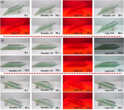 為了驗(yàn)證執(zhí)行器在實(shí)際應(yīng)用中的潛力,提出了三種基于執(zhí)行器的演示模型。第一個(gè)模型是仿生花(圖4)。通過交替加濕和近紅外光照射,可以表現(xiàn)出雙向彎曲變形,模仿自然花朵的開合運(yùn)動(dòng)。