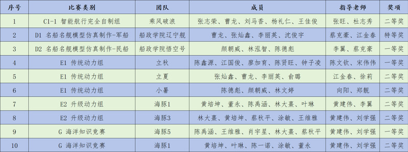 在全國海洋航行器大賽賽場上,吸引著來自北京大學(xué)、上海交通大學(xué)、浙江大學(xué)、哈爾濱工業(yè)大學(xué)等371所院校和科研院所的2785支參賽隊伍,覆蓋學(xué)生超萬人。大賽圍繞創(chuàng)新創(chuàng)意創(chuàng)業(yè)、設(shè)計與制作、智慧船舶與海洋工程技術(shù)、名船名艦?zāi)P头抡嬷谱鳌⒋8偹?、帆船模型競速、海洋知識競賽七大類比賽項目展開角逐。我校參賽學(xué)生在此次賽事中再創(chuàng)佳績,共獲得特等獎1項、一等獎3項、二等獎6項。