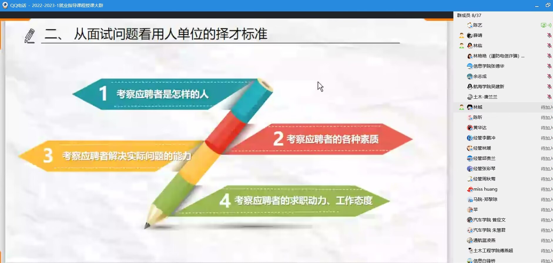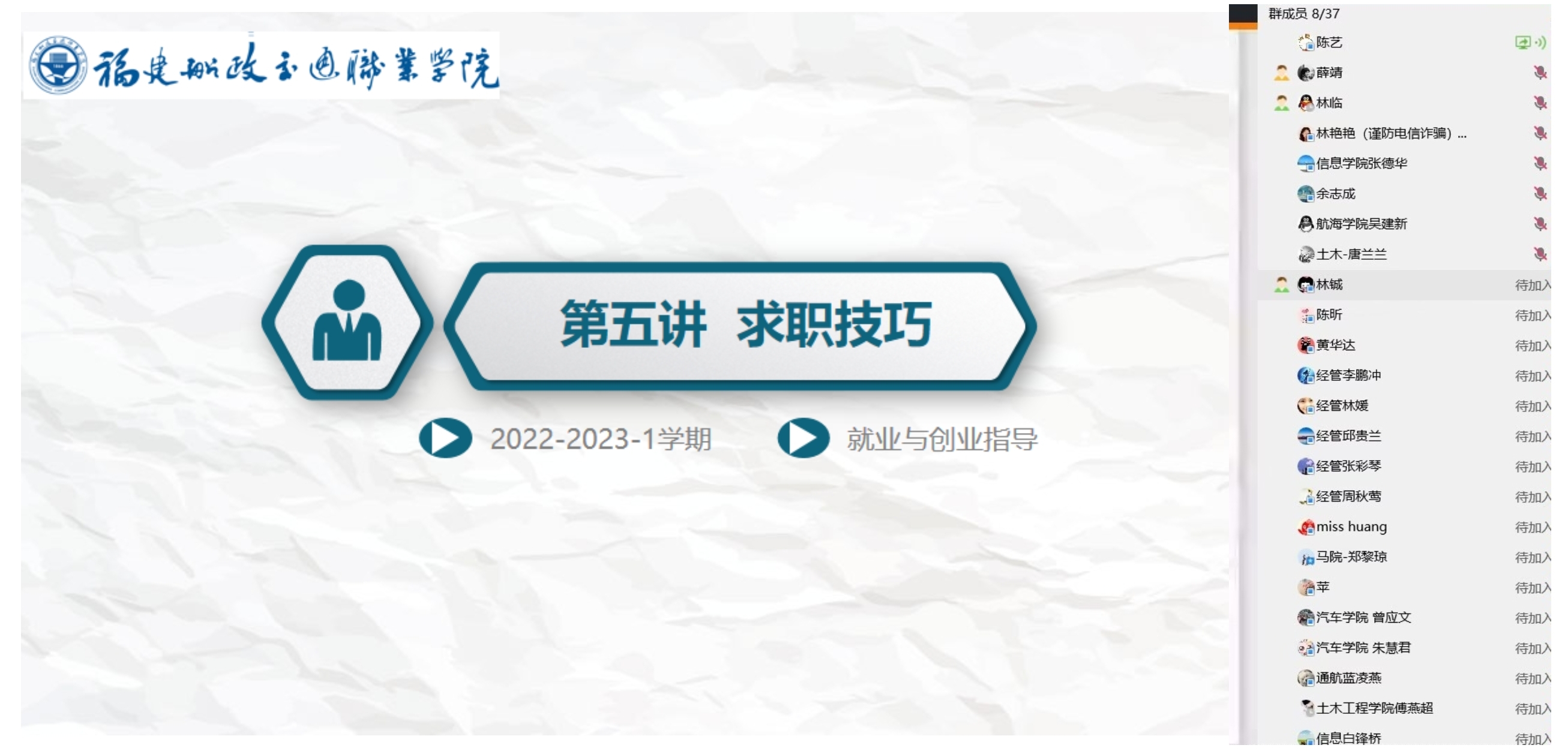 8月10日,馬克思主義學院就業(yè)與創(chuàng)業(yè)教研室按計劃舉辦了本學期第五次線上集體備課活動。本次活動由就業(yè)與創(chuàng)業(yè)教研室主任薛靖老師主持,由老師陳藝主講,其他講授本課的專兼職教師共同參與,本次備課主題為“第五講求職技巧”。