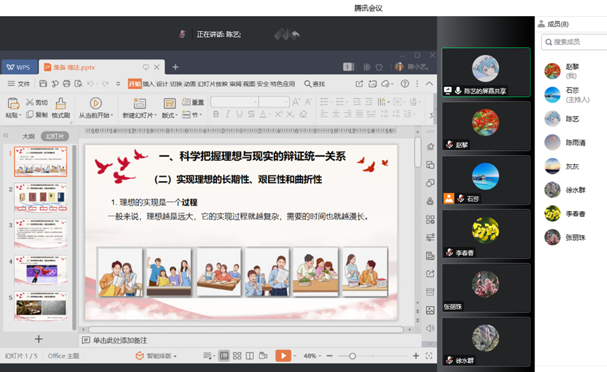接著,陳雨清老師和陳藝?yán)蠋熥隽似谓虒W(xué)分享,《堅(jiān)持走中國特色社會(huì)主義道路》和《實(shí)現(xiàn)理想的艱巨性、長期性、曲折性》,雨清老師和陳藝?yán)蠋熱槍@兩個(gè)部分的教學(xué)做了充分的準(zhǔn)備,教學(xué)效果良好。