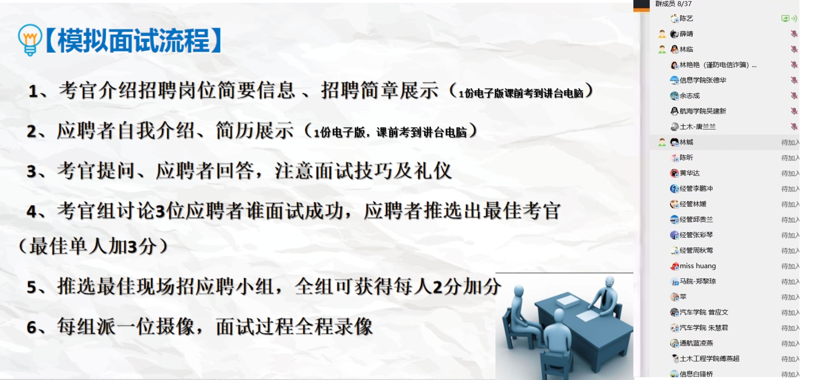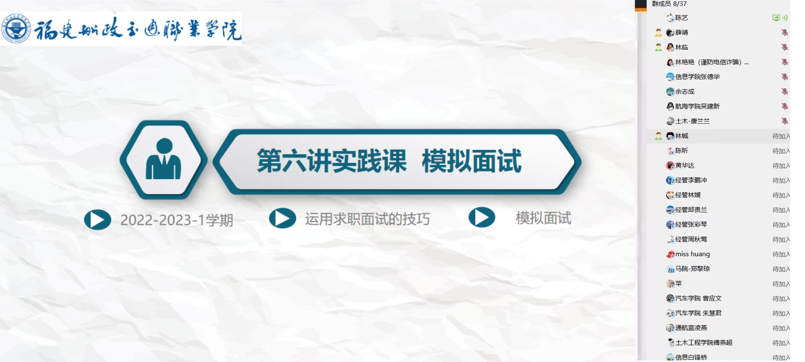 8月13日,馬克思主義學(xué)院就業(yè)與創(chuàng)業(yè)教研室按計(jì)劃舉辦了本學(xué)期第六次線(xiàn)上集體備課活動(dòng)。本次活動(dòng)由就業(yè)與創(chuàng)業(yè)教研室主任薛靖老師主持,由老師陳藝主講,其他講授本課的專(zhuān)兼職教師共同參與,本次備課主題為“第六講 求職技巧 實(shí)踐課--模擬面試”。