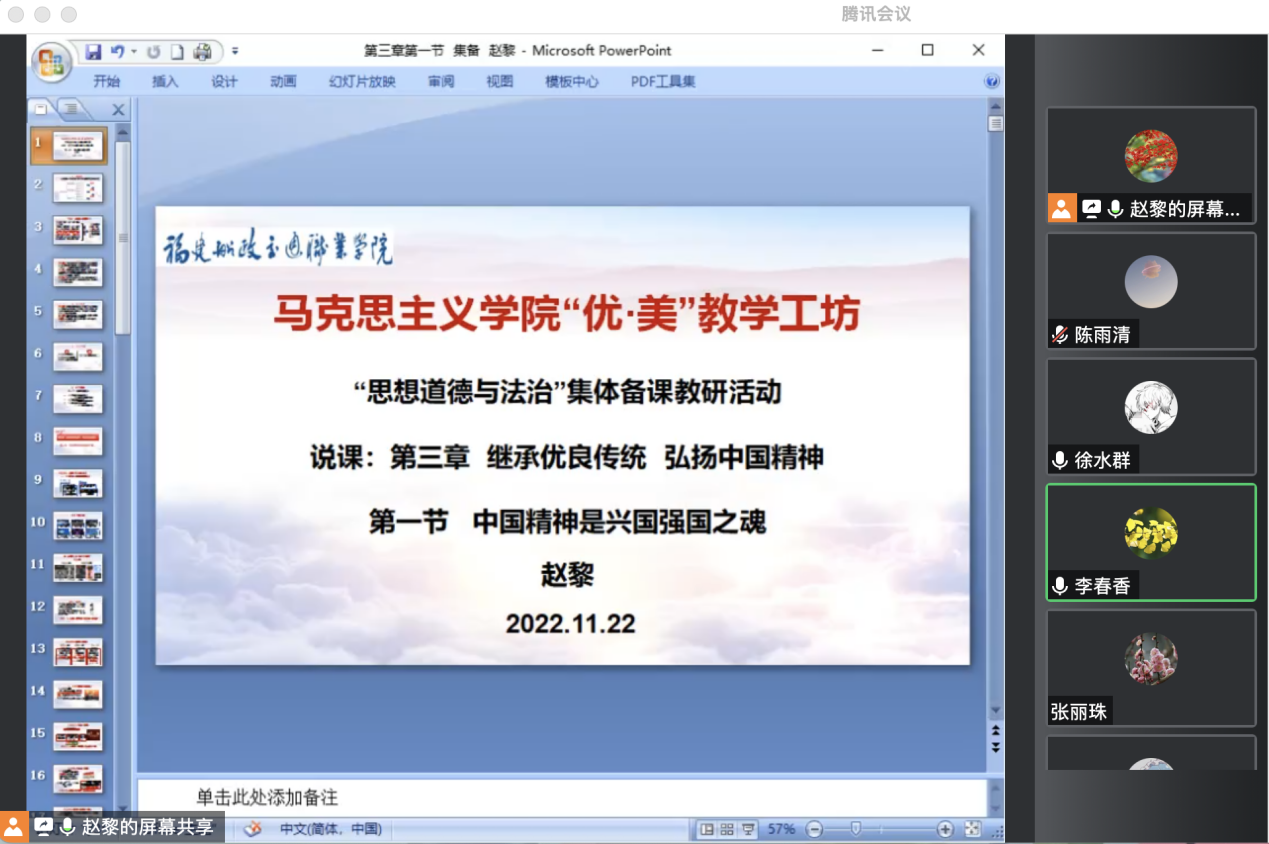 為進(jìn)一步提升教學(xué)質(zhì)量,推進(jìn)思政課課程建設(shè),馬克思主義學(xué)院思想道德與法治教研室于11月22日在線上進(jìn)行了本學(xué)期的第6次集體備課。