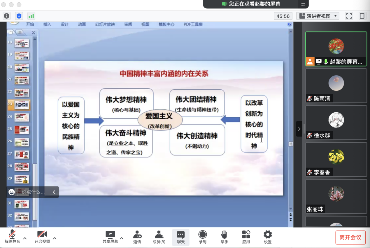 趙黎老師先就第三章弘揚(yáng)中國精神在全書中的地位和作用做了簡單闡述,并分析了學(xué)生的基本學(xué)情以及教學(xué)重難點(diǎn),之后對(duì)第三章第一節(jié)的整體教學(xué)設(shè)計(jì)做了詳細(xì)的分享。趙黎老師在整個(gè)教學(xué)設(shè)計(jì)中突出呈現(xiàn)問題導(dǎo)向,綜合運(yùn)用學(xué)習(xí)通和QQ群、騰訊會(huì)員等信息化教學(xué)模式,在教學(xué)展示中體現(xiàn)學(xué)生主體地位,并呈現(xiàn)對(duì)學(xué)生的吸引力。
