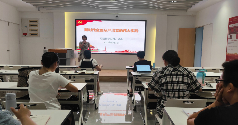2022年9月7號(hào)上午,形勢(shì)與政策教研室舉行了本學(xué)期第一次集體備課會(huì),由教研室主任嚴(yán)兵老師主持,藍(lán)素瓊老師就“形勢(shì)與政策”課第一專題“新時(shí)代全面從嚴(yán)治黨的偉大實(shí)踐”主講,梁晶老師和蘇梅貴老師進(jìn)行片段教學(xué),全體專兼職任課教師參加了會(huì)議。會(huì)議分為兩個(gè)階段。